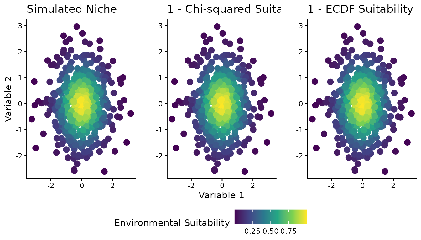 Figure 1 shows the 2D environmental space (two predictor variables) with color representing different suitability definitions: the simulated “true” niche, the chi-squared-based suitability, and the ECDF-based suitability.
